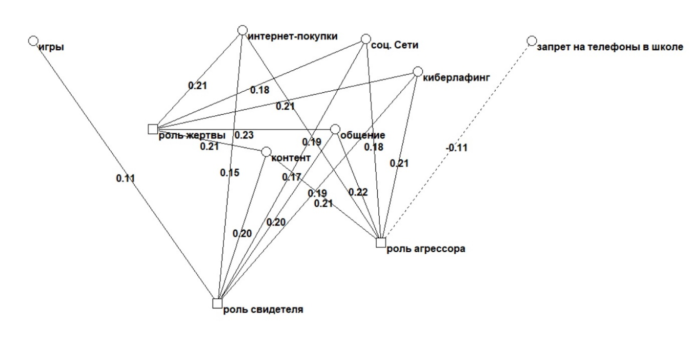 Исключение составил игровой киберлафинг, который оказался связан только с вовлеченностью в кибербуллинг в роли свидетеля (rs=0,11; р=0,05). Запрет на использование телефона в образовательном учреждении коррелирует с вовлеченностью в кибербуллинг в роли агрессора (rs=-0,11; р=0,05). Причем эта связь носит обратный характер.