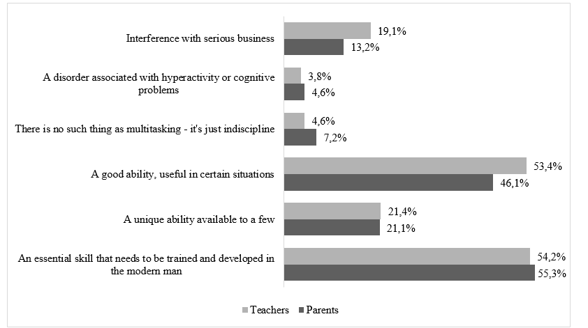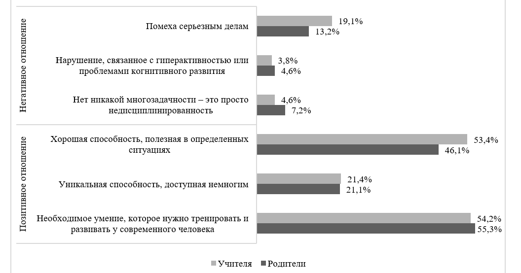 В качестве одного из ответов на новые вызовы для технологически расширенной личности стала набирать популярность идея о том, что освоение такой практики, как деятельность в формате многозадачности – совмещение или переключение между несколькими заданиями (Солдатова и др., 2020; Ophir, Nass, Wagner, 2009), может обеспечивать успешность человека в современных условиях. Способность действовать в многозадачном режиме требуется в описаниях вакансий на различные должности, ее начинают рассматривать как одну из важных надпрофессиональных компетенций (Варламова, Судаков, 2021), определяющих успех вне зависимости от конкретной специализации и требующих формирования в рамках образовательного процесса (Зеер и др., 2019). В контексте цифровизации образования многозадачность становится не только компетенцией, которую необходимо формировать у обучающихся, но и требованием к эффективному педагогу (Петраш, Сидорова, 2021). При этом в научной среде не существует однозначной позиции о пользе или вреде для развития детей и подростков многозадачности и ее вида – медиамногозадачности (ММЗ), а также их эффективности (Солдатова и др., 2020; May, Elder, 2018; Popławska, Szumowska, Kuś, 2021). В российском педагогическом сообществе подвергается сомнению польза развития ММЗ учеников и педагогов в условиях цифровизации образования (Поликарпова, 2020; Сидорова, 2021). Противоречивость дискурса, посвященного ММЗ в современной образовательной среде, ставит вопрос об отношении к данному феномену со стороны значимых взрослых, участвующих в социализации детей и подростков. Транслируемые со стороны взрослых установки по отношению к ММЗ могут вносить вклад в развитие или ограничение данной практики в среде подрастающего поколения.