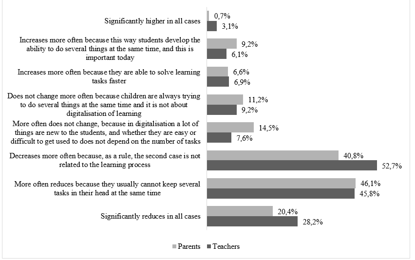 Более половины учителей и родителей (58%) оценивают себя как многозадачников (4-5 баллов по шкале оценки), 29,7% включают в свою деятельность элементы ММЗ (3 балла) и лишь 12,4% считают себя скорее однозадачными (1-2 балла). Практически каждый второй родитель (46,7%) считает, что его ребенок скорее однозадачный, и только каждый пятый родитель (22,4%) видит своего ребенка как многозадачника. Две трети (69,3%) родителей и учителей хотели бы в большей мере усилить свою способность к ММЗ (баллы от 3 до 5 по шкале оценки), а большинство родителей (77,6%) хотели бы этого же у своих детей.