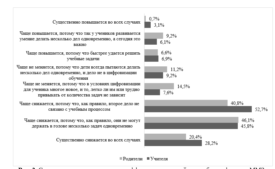 Большинство родителей и учителей считают, что в формате ММЗ эффективность обучения скорее снижается, чаще из-за того, что другое дело не связано с учебой или из-за неспособности детей удерживать в голове несколько задач одновременно (рис. 2). Различия между мнениями родителей и учителей были рассмотрены на основании разделения их на четыре группы в соответствии с множественными вариантами ответов: позитивная оценка эффективности (повышается), нейтральная (не меняется эффективность), негативная (снижается), противоречивая (равное количество ответов о снижении и повышении эффективности). В результате было выявлено, что 10,2% учителей и 12,5% родителей считают, что эффективность ребенка улучшается при использовании формата ММЗ в обучении; 85% учителей и 74,3% родителей – что снижается, и 3,1% учителей и 11,8% родителей считают, что эффективность ребенка не меняется; 1,6% учителей и 1,3% родителей имеют противоречивое мнение (χ2 = 7,971, df = 3; p = 0,047). Родители чуть более оптимистично оценивают ММЗ, полагая, что она не влияет на эффективность в учебном процессе, в то время как учителя считают, что ММЗ ему чаще мешает (рис. 2).