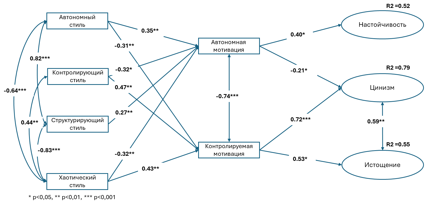 Как следует из структурной модели, автономный стиль научного руководства является положительным предиктором автономной мотивации (внутренняя и идентифицированная) и отрицательным – контролируемой (экстернальная мотивация и амотивация), тогда как структурирующий стиль – автономной. Контролирующий и хаотический стили являются отрицательными предикторами автономной мотивации и положительными – контролируемой. Автономная мотивация является положительным предиктором настойчивости и отрицательным – цинизма, тогда как контролируемая предсказывает оба аспекта выгорания. Эти два типа мотивации опосредуют влияние стилей научного руководства на зависимые переменные.