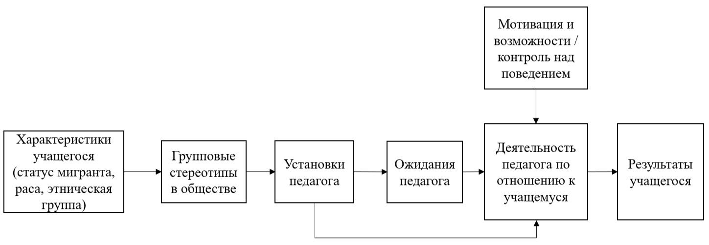Для отбора и анализа исследований связи установок и ожиданий педагогов с образовательными результатами учащихся с миграционным опытом мы использовали следующую теоретическую модель (см. рисунок).