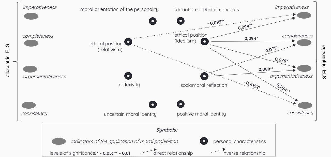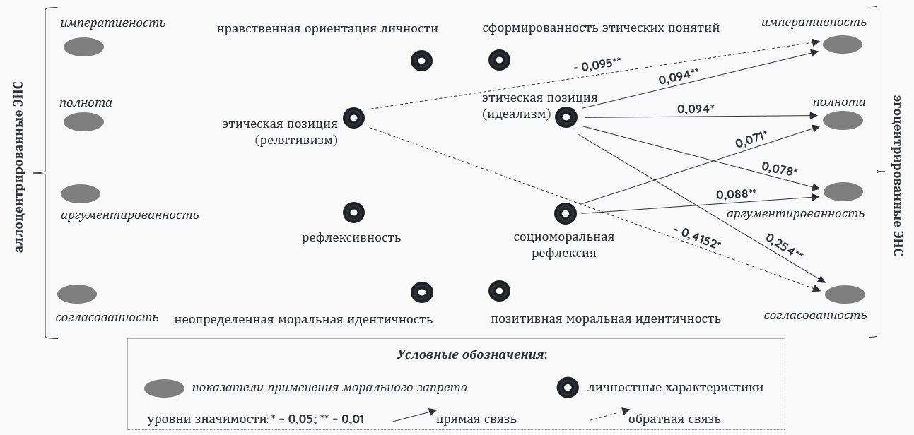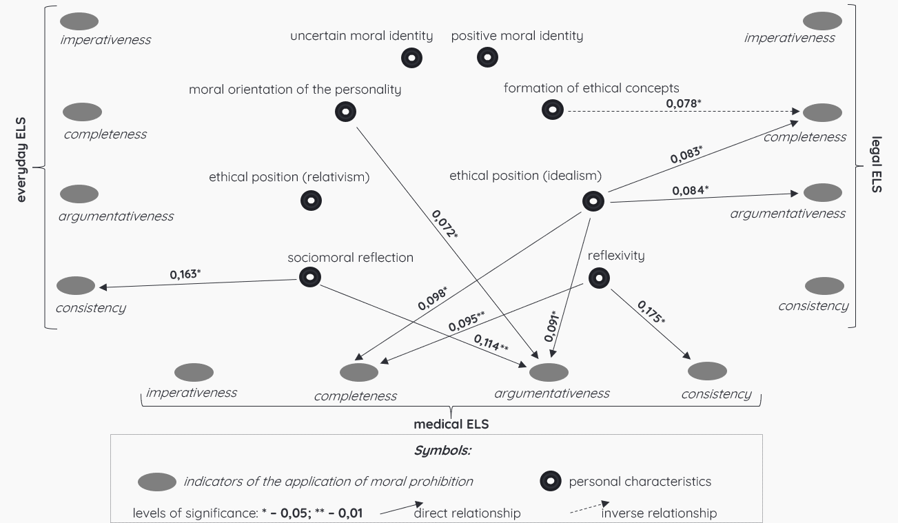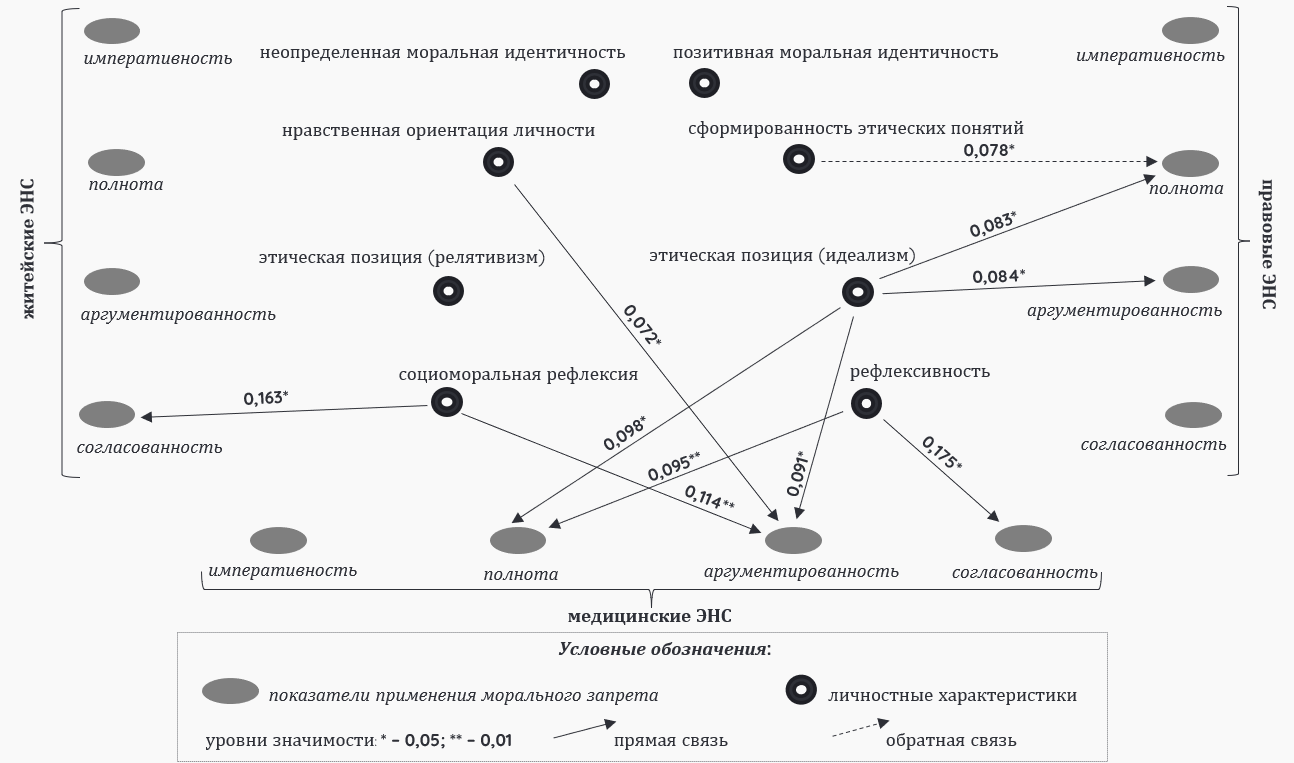 В моделях полноты запрета в правовом контексте выявлено интерактивное взаимодействие этого критерия морального запрета этической позиции идеализм, сформированности этических понятий, тогда как в медицинских ЭНС установлен достоверный отклик полноты и на данную этическую позицию, и на рефлексивность. В моделях аргументированности запрета в медицинском контексте найдены предсказанные условия взаимодействия этого критерия для большего числа личностных характеристик (социоморальная рефлексия, этическая позиция идеализм и нравственная ориентация личности), чем в аналогичной модели, построенной для правовых ЭНС.
