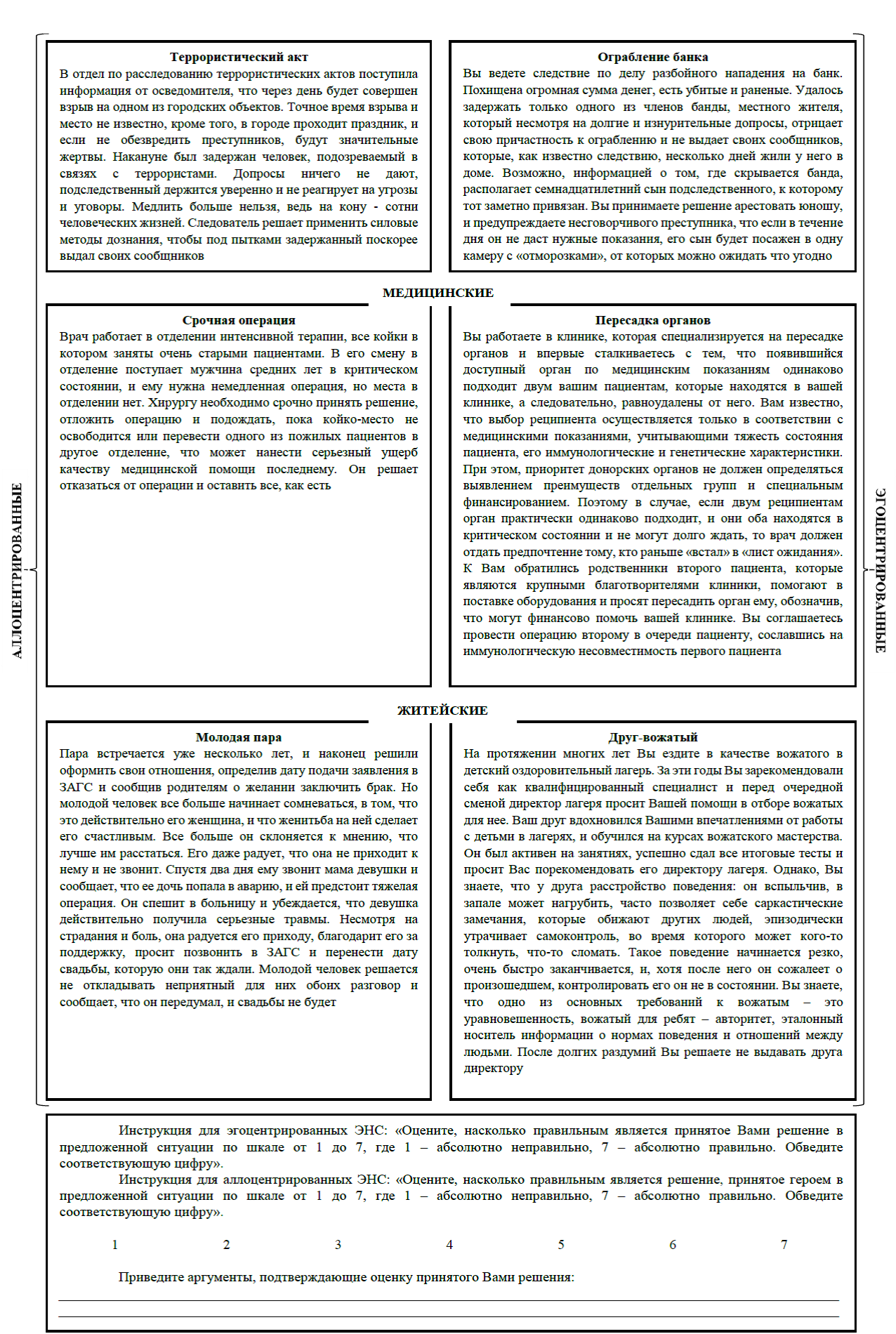 В методику вошло 12 ситуаций (по 4 для каждого предметного контекста). Половина из них была сформулирована так, чтобы в ней студент как будто действовал сам (эгоцентрированный фокус действия), другая половина предполагала аллоцентрированный фокус действия (решение принимается от лица действующего персонажа). Испытуемым предлагалось, во-первых, оценить правильность принятого главным героем решения в каждой из предложенных ситуаций и, во-вторых, обосновать свою оценку. Примеры ситуаций и инструкции к ним иллюстрирует рис. 1.