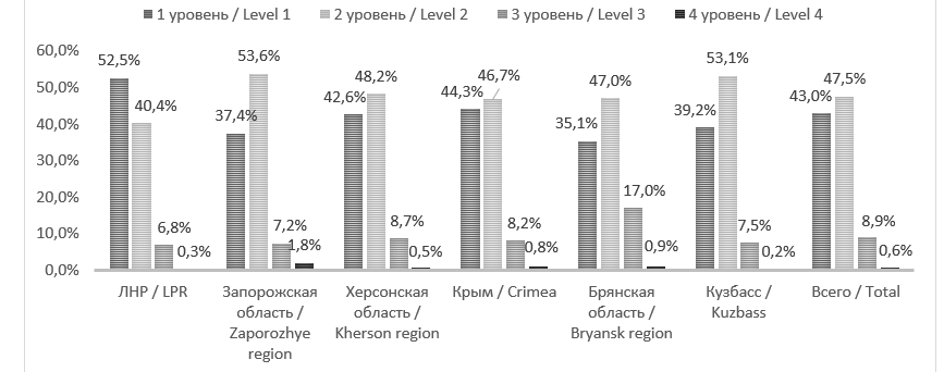 Родители использовали для описания состояния своих детей родительскую версию указанной скрининговой методики, педагоги — версию, предназначенную для педагогов. Отличия между версиями касаются обстановки, в которой оценивается ребенок: домашней и школьной. Родителям были предложены список событий для инвентаризации травматического опыта ребенка, связанного и не связанного с боевыми действиями, разработанный в целях исследования, а также Родительская анкета для оценки травматических переживаний детей (Тарабрина, 2001), которая состоит в том числе из шкал, представляющих выраженность проявлений в соответствии с отдельными критериями ПТСР: А (переживание интенсивных эмоций, вызванных серьезной угрозой жизни и здоровью), В (настойчивое повторение переживаний), С (избегание стимулов, субъективно связанных с травматическими событиями, и действий, ранее бывших привлекательными), D (наличие симптомов возбуждения, не свойственных до травматического события), F (нарушения функционирования в нескольких значимых сферах жизни), а также итогового показателя, суммирующего критерии от B до F. В рамках настоящего исследования предложены следующие показатели распределения по уровням на основании суммарного показателя: 0 баллов — отсутствие проявлений ПТСР (далее — первый уровень); 1-15 баллов — наличие отдельных проявлений ПТСР (далее — второй уровень), более 15 баллов — множественные проявления ПТСР (далее — третий уровень).