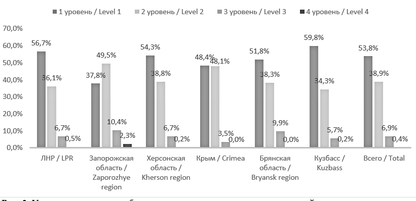 На основании предложенных выше критериев отнесения к различным уровням дезадаптации (см. раздел «Материалы и методы») проанализирована представленность уровней дезадаптации детей в рассматриваемых регионах на основе оценок родителей (рис. 1) и педагогов (рис. 2). Различия в представленности уровней дезадаптации по регионам показывают больший уровень статистической значимости по данным, полученным на основании оценок педагогов χ² = 46,942, p ≤ 0,001, чем на основании оценок родителей χ² = 25,815, p ≤ 0,040.