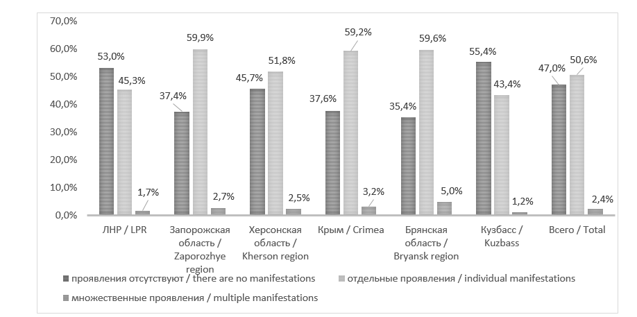 Среди обучающихся из ЛНР и Кузбасса более чем в 50% случаев родители не отмечают у детей никаких проявлений ПТСР, а число выявленных случаев выраженных проявлений ПТСР находится в пределах 2%. Напротив, результаты анкетирования родителей обучающихся Запорожской, Херсонской, Брянской областей и Крыма указали на преобладающее число детей с отдельными проявлениями проявлений ПТСР. Процент детей с множественными проявлениями ПТСР в этих регионах также выше. Различия в представленности уровней выраженности проявлений ПТСР по регионам статистически значимы χ² = 71,860, p ≤ 0,001.