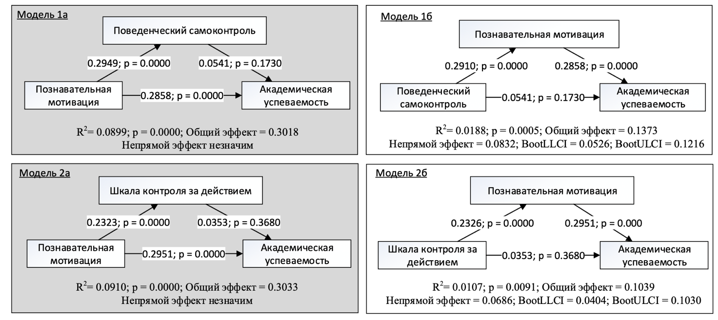 На рис. 1 приведены четыре модели для познавательной мотивации. В моделях 1а и 2а познавательная мотивация выступает в качестве предиктора, а в моделях 1б и 2б – в качестве медиатора. Как можно видеть, для моделей 1а и 2а наблюдается значимый положительный прямой эффект влияния мотивации на академическую успеваемость, тогда как непрямой эффект, обусловленный медиаторным влиянием показателей «Шкалы контроля за действием» и поведенческого самоконтроля, в этих моделях оказался незначимым, что свидетельствует об отсутствии значимого медиаторного эффекта. В моделях 1б и 2б, напротив, прямой эффект влияния «Шкалы контроля за действием» и поведенческого самоконтроля на академическую успеваемость оказался незначимым, а непрямой эффект, обусловленный медиатором – познавательной мотивацией, оказался значимым. Причем эффект влияния на академическую мотивацию «Шкалы контроля за действием» выше (0,0832), чем «Поведенческого самоконтроля» (0,0686). Однако эти опосредованные эффекты оказались меньше, чем прямые эффекты от «Познавательной мотивации» (0,2858 и 0,2958). В связи с этим можно предположить, что познавательная мотивация сама по себе оказывает влияние на успеваемость независимо от индивидуальных особенностей волевой регуляции учащихся, а вот особенности воли – только опосредованно через мотивацию.