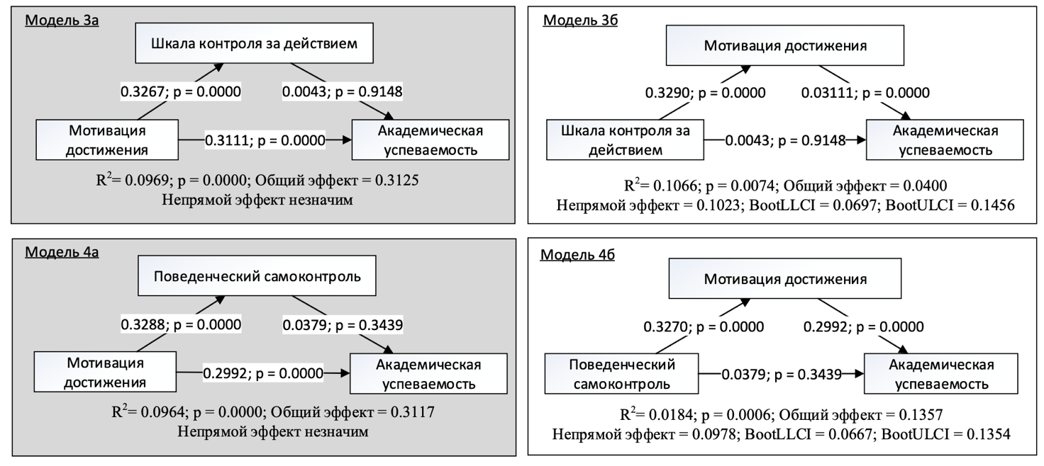 Для моделей 3а и 4а был получен значимый прямой эффект влияния мотивации достижения на академическую успеваемость, а непрямой эффект, связанный с медиацией показателей «Шкалы контроля за действием» и «Поведенческого самоконтроля», оказался незначимым (рис. 2). Соответственно, в данном случае медиаторные эффекты отсутствуют. Для моделей 3б и 4б, напротив, эффекты прямого влияния «Шкалы контроля за действием» и «Поведенческого самоконтроля» оказались незначимыми, а непрямые эффекты, обусловленные медиацией мотивации достижения, – значимыми. В связи с этим можно заключить, что для мотивации достижения наблюдаются сходные закономерности, как и для познавательной мотивации. Она может выступать медиатором для «Шкалы контроля за действием» и «Поведенческого самоконтроля». Однако прямые эффекты мотивации достижения также оказались выше (0,3111 и 0,2992), чем опосредованные эффекты показателей волевой регуляции, при этом влияние «Шкалы контроля за действием» выше, чем «Поведенческого самоконтроля» (0,1023 и 0,0978 соответственно).