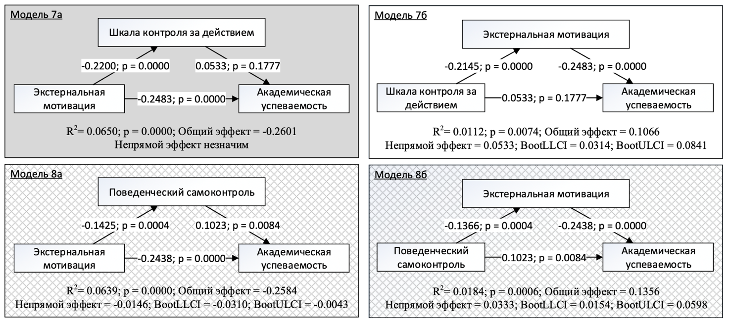На рис. 4 представлены модели для экстернальной мотивации: для моделей 7а и 8а она выступает в качестве предиктора, а для моделей 7б и 8б – в качестве медиатора. Для модели 7а был получен значимый отрицательный прямой эффект влияния экстернальной мотивации на успеваемость, а непрямой эффект, связанный с медиацией «Шкалы контроля за действием», оказался незначим. Для модели 7б, напротив, прямой эффект влияния «Шкалы контроля за действием» на успеваемость оказался незначим, а непрямой эффект, связанный с медиацией экстернальной мотивации, значим. Однако размеры прямого и непрямого эффектов в данном случае совпадают, что ставит под сомнение значимость этого эффекта. Для моделей 8а и 8б были обнаружены значимые прямые и непрямые эффекты. Однако прямые эффекты в разы превосходили непрямые. Это позволяет предполагать, что в случае с поведенческим самоконтролем и экстернальной мотивацией медиаторные эффекты не оказывают заметного влияния на успеваемость.
