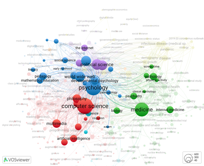 Алгоритмический анализ платформы выделил семь кластеров, объединяющих термины по определенным научным областям. Самый крупный кластер (110 терминов) связан с исследованиями в области компьютерных наук: «искусственный интеллект», «взаимодействие человека и компьютера», «мультимедиа», «компьютерная безопасность», «машинное обучение» и др. Второй по численности кластер (107 терминов) охватывает передовые медицинские исследования, включая современные устройства для детей с ОВЗ, цифровое здравоохранение: «здравоохранение», «патология», «психиатрия», «педиатрия», «клиническая психология», «ожирение», «психическое здоровье», «офтальмология», «COVID-19» и др. Третий кластер (58 терминов) объединяет исследования по психологии и обучению, включая влияние технологий на образование: «психология», «психология развития», «когнитивная психология», «образование», «педагогика», «грамотность», «дошкольное образование», «цифровое обучение», «социальные сети», «нейронаука», «коммуникация» и др. Четвертый кластер (32 термина) отражает исследования экономических и социальных процессов, связанных с влиянием пандемии и цифровизации: «экономика», «демография», «экономический рост», «политология», «неравенство», «бедность», «пандемия», «цифровой разрыв» и др. Пятый кластер (27 терминов) охватывает правовые и политические аспекты современных технологий: «связи с общественностью», «интернет», «конфиденциальность в интернете», «законодательство», «порнография», «вред» и др. Шестой кластер (20 терминов) имеет узкоспециализированную направленность, концентрируясь на междисциплинарных исследованиях слуха, речевых процессов и языковых технологий, включая медицинские и технологические аспекты: «акустика», «лингвистика», «коммуникация», «аудиология», «адаптация», «распознавание речи», «письмо» и др. Седьмой кластер (9 терминов) включает новые и междисциплинарные исследования, связанные с цифровой культурой: «гаджет», «использование медиа», «любопытство», «популярность», «зависимость» и др.