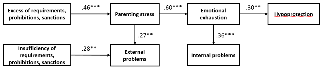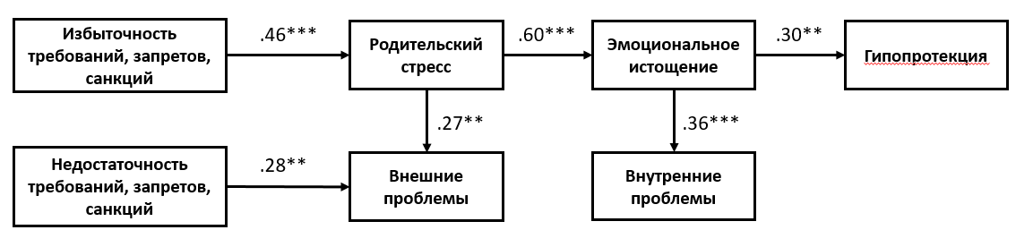 Проверка теоретической модели методом путей в программном комплексе AMOS (применение данного вида анализа соответствует необходимым требованиям к объему выборки) показала хороший уровень согласия модели с данными: хи-квадрат = 15,859; df = 15; p = 0,391; CFI = 0,989; GFI = 0,946; RMSEA = 0,028; Pclose = 0,578. Выявлено, что применение матерями чрезмерного количества требований, запретов и наказаний и неустойчивость в своих взглядах на воспитание приводят к появлению РС, провоцирующего появление ЭИ, в результате чего матери дошкольников начинают снижать меру своей заботы о ребенке, что в результате приводит к формированию нового стиля воспитания по типу гипопротекции. В свою очередь, появление у дошкольников внешних проблем провоцирует деструктивный стиль материнского воспитания, связанный с избыточностью или недостаточностью требований, обязанностей и санкций. Стиль воспитания, основанный на недостаточности требований, запретов и санкций, оказывает прямое воздействие на появление у дошкольника внешних трудностей, тогда как избыточность оказывает опосредованное влияние на внешние трудности ребенка, через РС матери. Причиной же появления внутренних проблем дошкольника является прямое влияние ЭИ матери и опосредованное влияние РС и стиля воспитания, основанного на избыточности требований, запретов и санкций. Результат эмпирической модели представлен на рисунке.