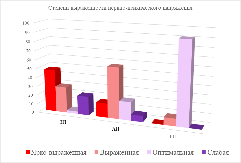 Анализ распределения детей с разными профилями ПВ по степени выраженности нервно-психического напряжения в учебной нагрузке по χ² позволил установить, что ярко выраженная степень, являющаяся индикатором низкого уровня адаптации к учебной нагрузке, не встречается среди учеников с ГП, а с АП (15,91%) выявляется достоверно реже, чем с ЗП (47,37), при p < 0,001. Выраженная степень (как индикатор пониженного уровня адаптации к учебной нагрузке) у участников с ГП (8,33%) встречается значимо реже, чем АП (56,82%) и с ЗП (28,95%), при p < 0,001. Также определяются значимые различия между численностью детей с дисгармоничными профилями ПВ: с АП учеников достоверно больше, чем с ЗП, при p < 0,001. Оптимальная степень выраженности, как индикатор оптимального уровня адаптации к учебной нагрузке, отмечается у подавляющего большинства учащихся с ГП (91,17%), что значимо чаще, чем с АП (20,45%) и с ЗП (2,63%), при p < 0,001. Замечено, что детей с АП, имеющих оптимальную степень, достоверно больше, чем с ЗП. Слабая степень (индикатор низкого уровня КПМ к учебной нагрузке) не зафиксирована ни у одного человека с ГП, а при ЗП с ней встречается детей достоверно чаще, чем при АП, при p < 0,03 (см. рисунок).