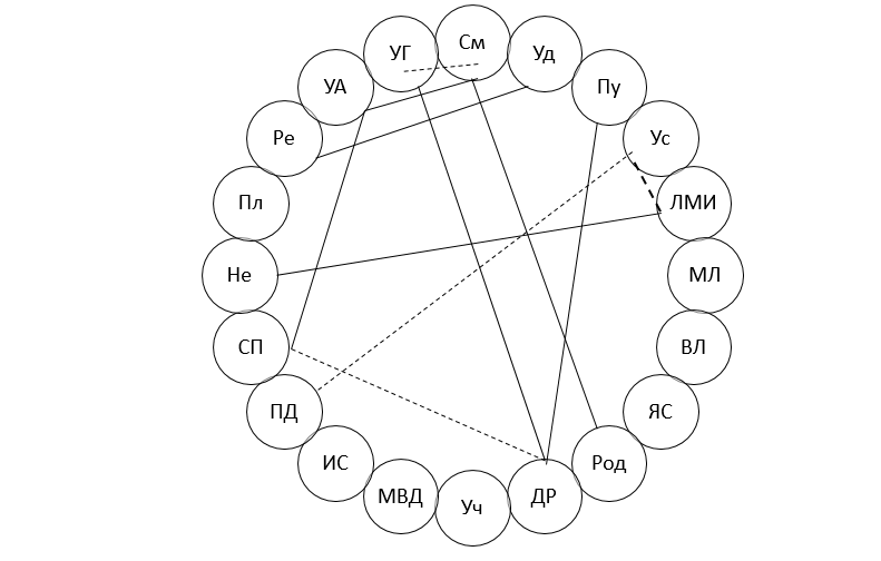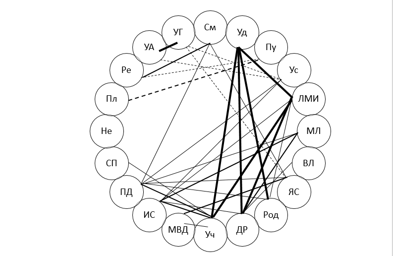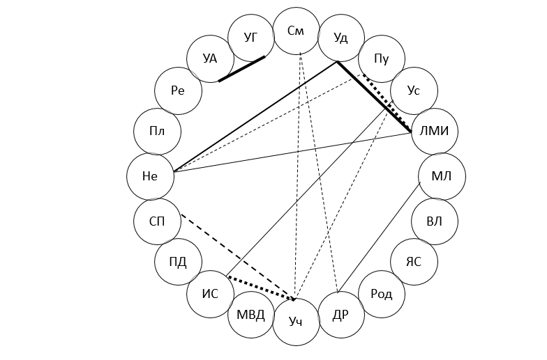 Примечания: С – смысл, Уд – удовольствие, Пу – пустота, Ус – усилие, ЛМИ – логико-математический интеллект, МЛ – интерперсональный интеллект, ВЛ – интраперсональный интеллект, ЯС – Я сам, Род – родители, Др – друзья, Уч – учитель, МВД – метакогнитивная включенность в деятельность, ИС – использование стратегий, ПД – планирование действий, СП – самопроверка, Не – неудача, Пл – планирование, Ре – реализация, УА – успеваемость по алгебре, УГ – успеваемость по геометрии. Жирными линиями обозначены корреляции, значимые при p≤0,001, полужирной линией – при p≤0,01, тонкой линией – при p≤0,05. Пунктирными линиями обозначены отрицательные корреляции аналогичных уровней значимости.