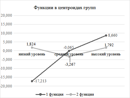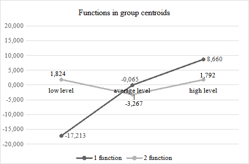 С целью различения групп преподавателей по уровню проявления педагогического консерватизма возникла необходимость применения дискриминантного анализа психологических показателей, который с помощью Лямбда-Уилкса позволил выявить две канонические дискриминантные функции на уровне p ≤ 0,0001. Первая функция демонстрирует дискриминации при соотношении низкого, среднего, высокого уровней педагогического консерватизма; вторая функция – дискриминации между средним и высоким уровнями педагогического консерватизма преподавателя вуза.