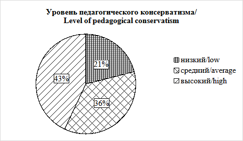 Данные, представленные на рис. 1, демонстрируют низкий уровень проявления педагогического консерватизма у 21% педагогов (от 43 до 79 баллов), выраженность среднего уровня состояния педагогического консерватизма определяется у 36% преподавателей (от 80 до 179 баллов), высокий уровень педагогического консерватизма обнаружен у 43% респондентов (от 180 до 215 баллов).