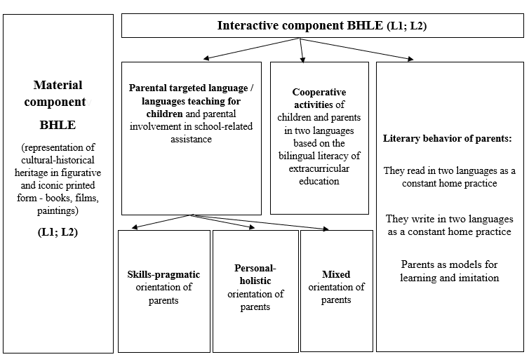 BHLE определяют через HLE как многокомпонентное образование (Lau, Richards, 2021; Senechal, LeFevre, Thomas et al., 1998). В соответствии с классификацией устного домашнего билингвального общения, оно может происходить по принципу: один родитель – один язык; одна ситуация/сфера жизни – один язык; одно время-один язык; чередование языков (один день – один язык, другой день – смена языка) (Romaine, 1995). Однако применительно к развитию навыка чтения и письма исследований гораздо меньше (Costa, Melo-Pfeifer, 2022; Roberts, Jurgens, Burchinal, 2005). Это частично связано с тем, что изучение билингвизма часто ведется вне контекста рассмотрения языковой личности ребенка-билингва, его картины мира и вне контекста его культурной идентичности (Протасова, Родина, 2005; Genesee, 2016).