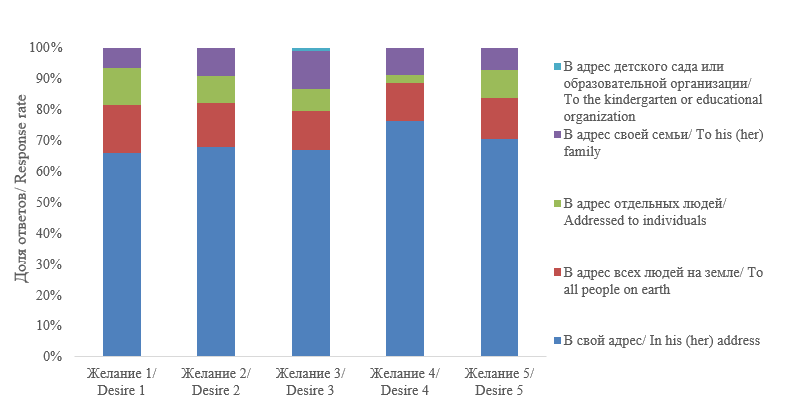 Преимущественная направленность детских желаний «на себя» отражает специфику дошкольного возраста, связанную с эгоцентрической позицией. Появление к концу дошкольного возраста желаний, направленных на других, связано с происходящей социализацией и включением ребенка в систему общественных отношений.