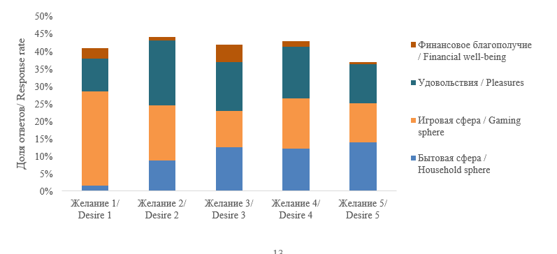 По содержанию желаний лидером стала игровая сфера (15,9%). С небольшим отрывом дальше следуют «удовольствия» и «здоровье», социальная сфера. Эти категории набрали более 10% ответов. Самыми редко упоминаемыми категориями были: «Финансовое благополучие», «Коммуникационная сфера» и желания о желаниях (золотую рыбку, волшебную палочку).