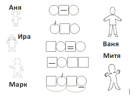 Сюжет задания. Эти дети поселились в стране Живых слов. Они умеют писать свои имена буквами. Но еще не научились записывать слова звуками. Помоги каждому ребенку закончить звуковую схему его имени: разделить каждое слово на слоги, поставить ударение, подчеркнуть безударные гласные, обозначить мягкость и твердость всех согласных. Покажи стрелочками, где чья схема: соедини портрет ребенка и звуковую схему его имени. Только будь осторожен: если перепутать имена, то все забудут этих детей – и друзья, и учителя, и даже родители! Сомневаешься, не рисуй стрелочку, поставь большой знак вопроса около рисунка ребенка!