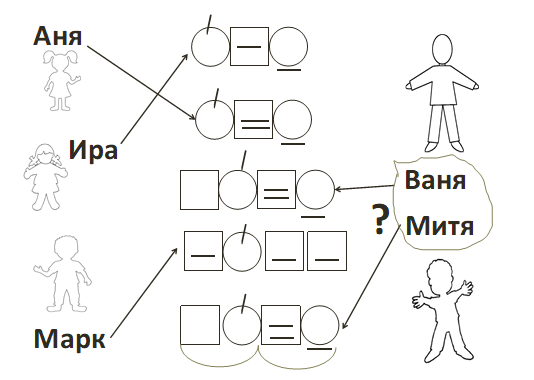 К доске выходит Степа и проводит еще одну стрелочку от имени Митя к пятой схеме.