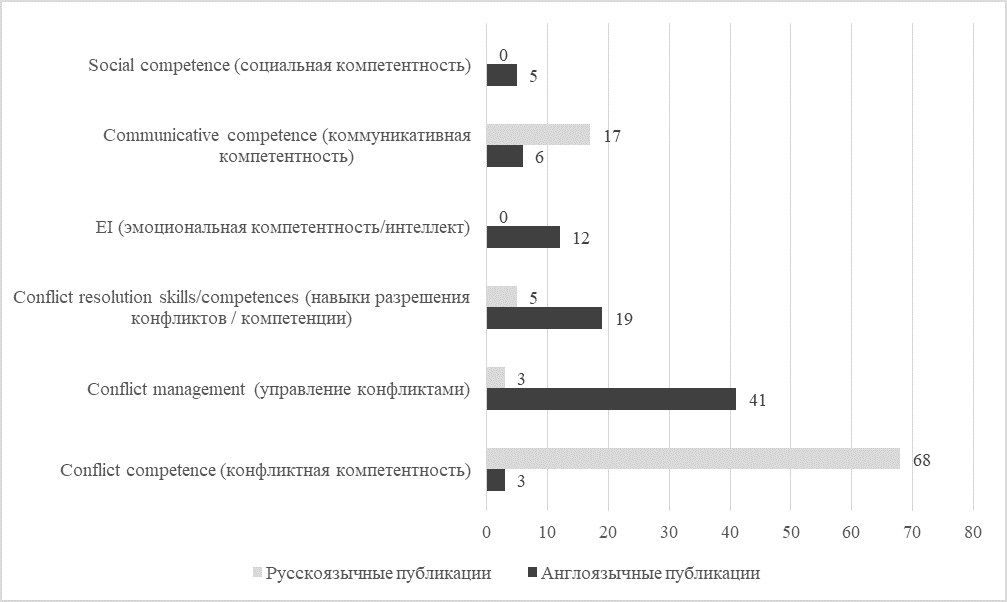 В большинстве зарубежных публикаций, близких по смыслу заявленной тематике, используется другое понимание конфликтной компетентности. Косвенно это подтверждается частотой использования ключевых слов, связанных с тематикой конфликтной компетентности (см. рисунок).