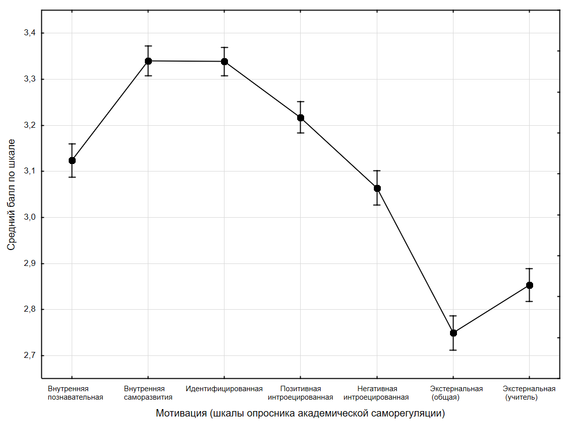 Рис. 2. Средние значения по шкалам опросника академической саморегуляции для всей выборки, N = 1913 (вертикальные отрезки обозначают 95% доверительный интервал)