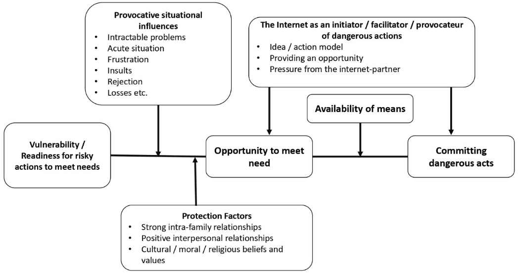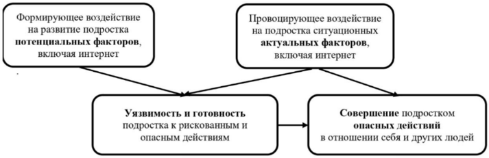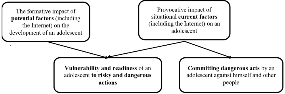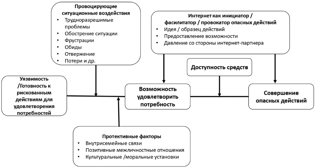 В качестве внешнего фактора защиты, опоры, помощи в решении этих проблем могут выступать связи с ближайшим окружением, прежде всего поддержка семьи, друзей, сверстников. Внутренними факторами, тормозящими опасное для себя или других поведение подростка, могут быть личностные установки, в том числе моральные или религиозные преграды и запреты. Однако протективные факторы могут отсутствовать или быть слишком слабыми для оказания сопротивления импульсам к рискованному поведению. Если в этот период возникает воздействие со стороны интернет-среды, которая предлагает конкретную идею, образец поведения или требование, способствующие удовлетворению потребности через опасное поведение, то, учитывая сформированную ранее готовность, такое поведение может быть реализовано в качестве виктимного или делинквентного (криминального). Наличие средств его осуществления повышает вероятность опасных поступков до максимума, а продолжающиеся стимулирующие воздействия со стороны интернета ведут к их реальному совершению.