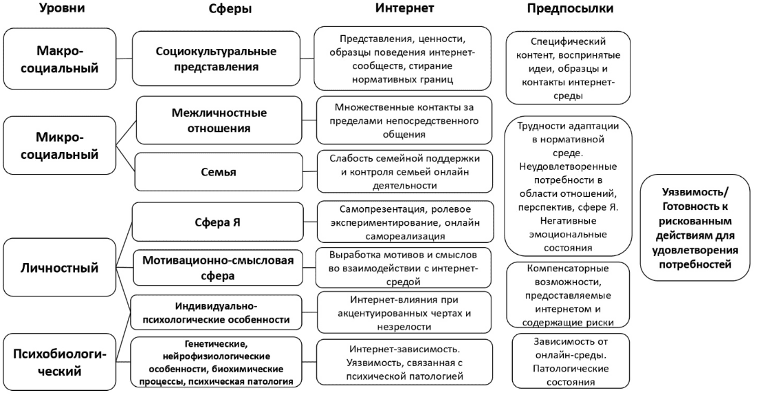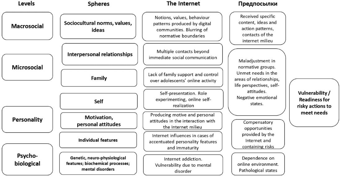 Таким образом, на всех уровнях и во всех сферах интернет может оказывать существенное влияние на формирование рискованного поведения детей и подростков, в особенности, при наличии у них проблем и нереализованных потребностей. В совокупности сочетание проблем в различных сферах с влиянием интернет-среды образует определенные предпосылки отклоняющегося, рискованного и опасного поведения. В общем виде к ним можно отнести следующие: