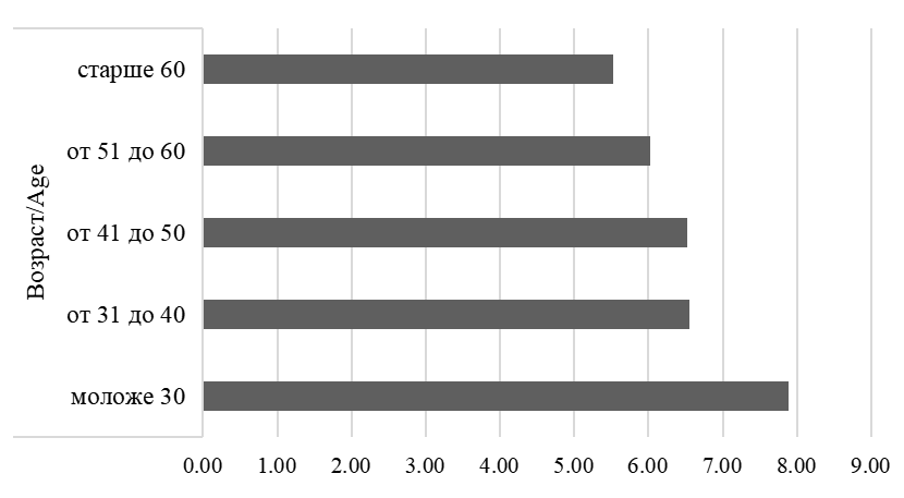 Как видно из таблицы, вторая фаза эмоционального выгорания находится в стадии формирования, т. е. профессионалы стараются экономить эмоции и разными способами защищаться от травмирующих ситуаций. Полученный результат позволяет предположить, что первую фазу напряжения участники исследования уже миновали, вторая фаза активного сопротивления стрессу формируется, а фаза истощения еще не достигла стадии формирования. Исходя их этого можно выдвинуть гипотезу о том, что уровень сформированности разных фаз эмоционального выгорания зависит от возраста. Распределение в выборке носит нормальный характер (критерий Шапиро—Уилла, уровень значимости > 0,001), поэтому для дальнейшего анализа будут использоваться параметрические методы. Корреляционный анализ Пирсона частично подтвердил данную гипотезу. Уровень сформированности первой фазы ЭВ отрицательно коррелирует с возрастом (r = –0,130; p < 0,05), т. е. молодые нотариусы испытывают большее напряжение, чем их старшие коллеги.
