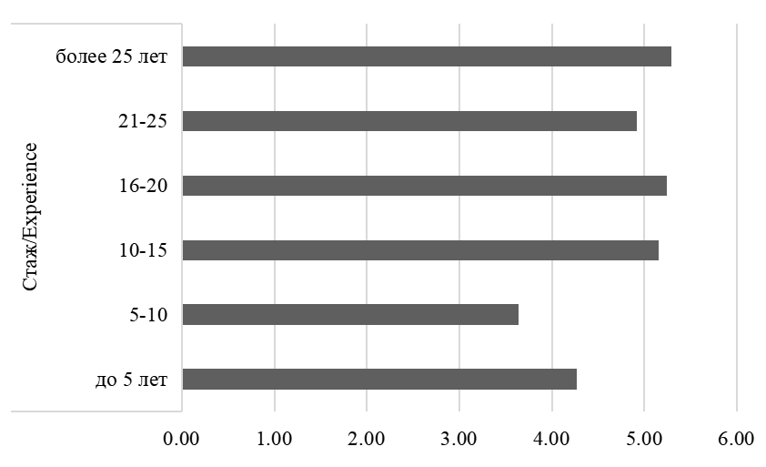 Гипотеза о том, что эмоциональное выгорание растет с увеличением профессионального стажа также не подтвердилась (p > 0,1).