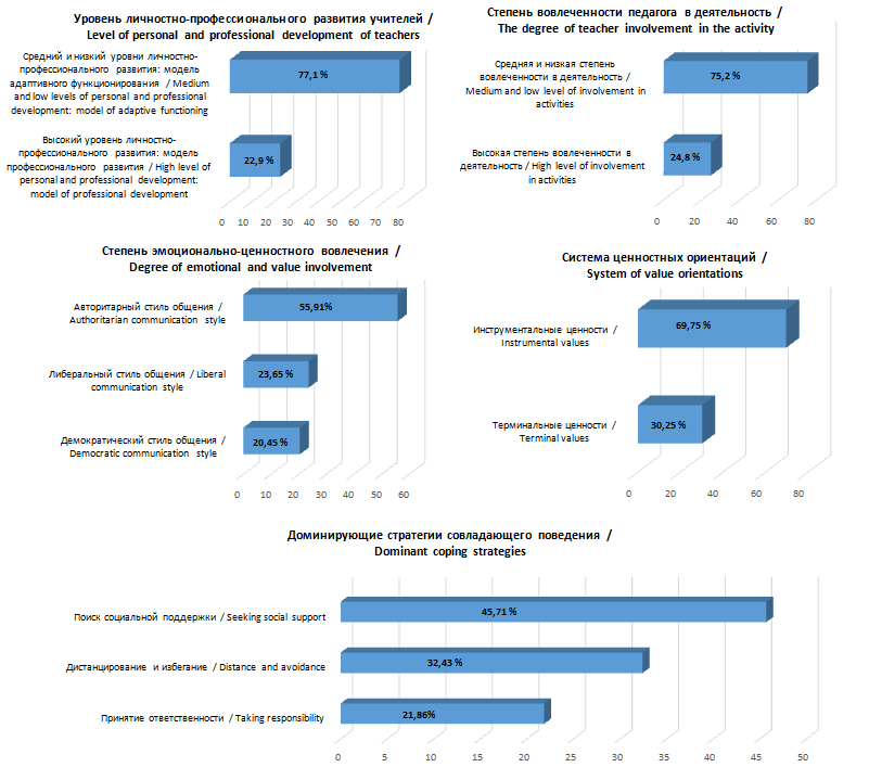 Определено, что большинство учителей относятся к модели адаптивного функционирования (77,1%) с низкими показателями «вовлеченность — вовлечение» (75,2%) (авторитарность, инструментальные ценности, поиск социальной поддержки) и лишь незначительная часть учителей (22,9%) относятся к развивающей модели с выраженной вовлеченностью (24,8%) в профессию (активность, приверженность, включенность) и способностью вовлекать учащихся в учебную деятельность и полисубъектную общность (демократический стиль общения, терминальные ценности, принятие ответственности).