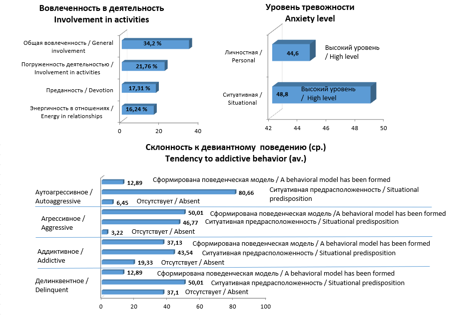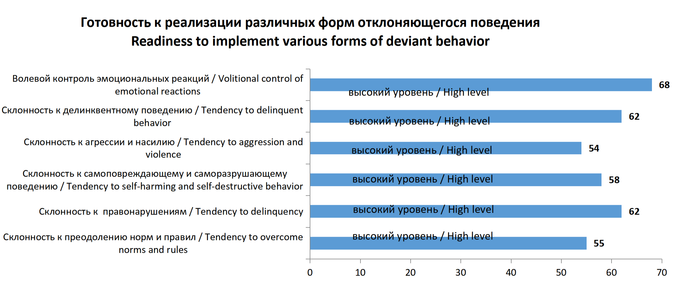 В соответствии с результатами, представленными на рис. 2, 62% учащихся демонстрируют склонность к правонарушениям (высокий уровень), для 56% учеников (высокий уровень) характерно зависимое поведение. Признаки пассивной невовлеченности в образовательное пространство (отчужденность, тревожность, беспокойство) выявлены у 65% обучающихся. Негативизм при активизации учебной нагрузки воспринимается школьниками как вынужденная вовлеченность (16,24%).