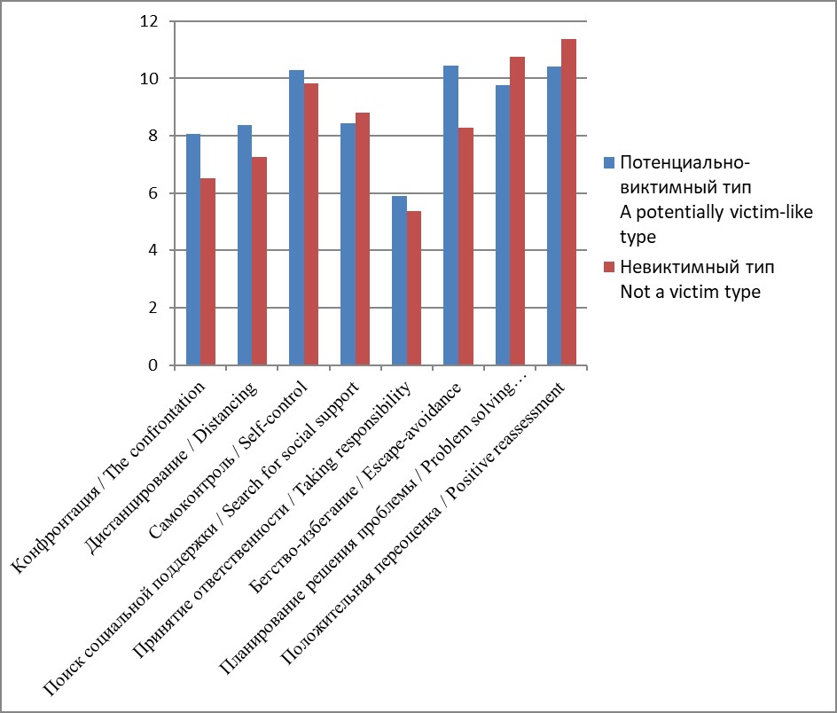 Рис. 2. Сравнительный анализ результатов обследования потенциально виктимного и невиктимного типов по опроснику «Стратегии совладающего поведения (СПП)