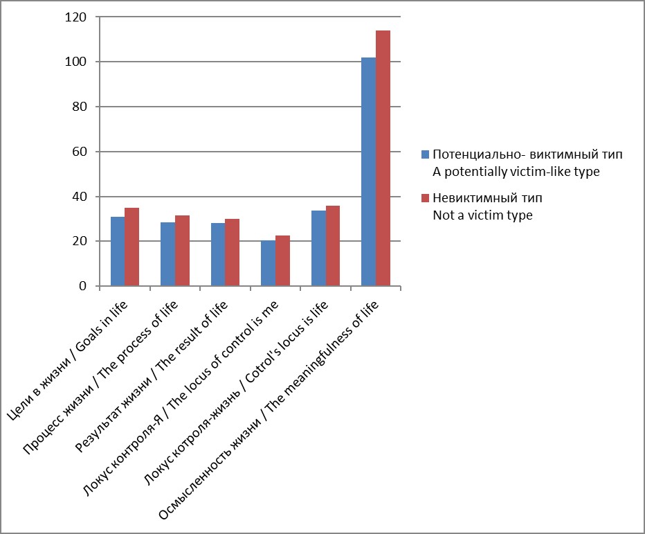Результаты сравнительного анализа потенциально виктимного и невиктимного типов курсантов по методике «Опросник смысложизненных ориентаций (СЖО), (Дж. Крамбо, Л. Махолик, адаптация Д.А. Леонтьева)» также показали значимость различий (р ≤ 0,01) по всем шкалам, средние значения которых выражены у курсантов невиктимного типа и находятся в пределах нормы. Значения ниже нормы выявлены у курсантов потенциально виктимного типа по шкалам: «Цели в жизни», «Процесс жизни», «Локус-контроля — Я», «Осмысленность жизни» (рис. 4). Так, для курсантов потенциально виктимного типа характерны: отсутствие целеустремленности; неудовлетворенность своей жизнью в настоящее время, в силу отсутствия интереса и эмоциональной насыщенности жизни; недостаточная сформированность представления о себе как о сильной личности; низкий уровень осмысленности жизни. Курсанты невиктимного типа отличаются целеустремленностью; наличием в их жизни целей, которые придают жизни осмысленность; они удовлетворены своей жизнью в настоящем, воспринимают свою жизнь как интересную и эмоционально насыщенную.