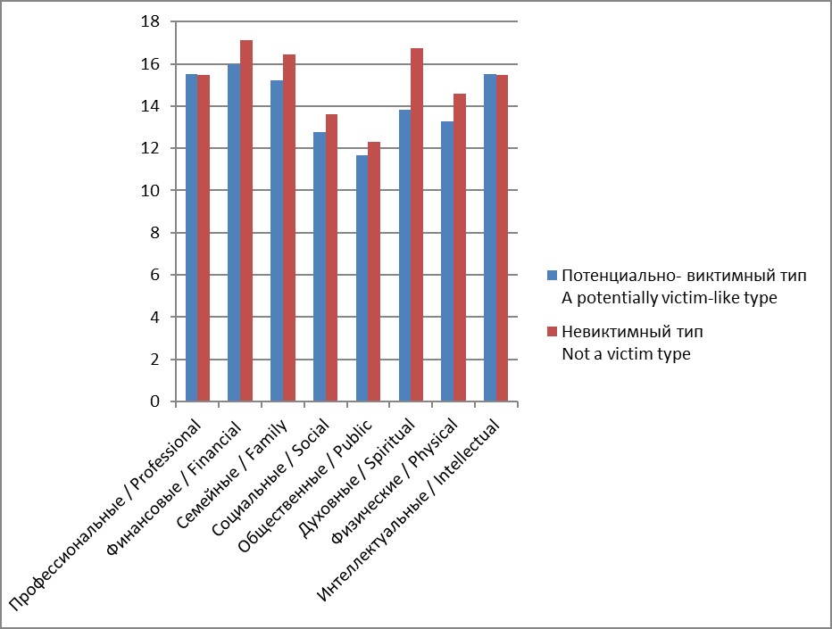 Наибольшую ценность для курсантов невиктимного типа представляют финансовые, семейные и духовные ценности, на втором месте — физические и социальные. У курсантов потенциально виктимного типа преобладают профессиональные и интеллектуальные ценности, на втором плане — семейные, физические и духовные. Однако стоит отметить, что у курсантов потенциально виктимного типа ценностные ориентации менее развиты, чем у курсантов невиктимного типа.