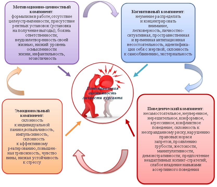 Для курсантов потенциально виктимного типа характерна склонность оказываться в опасных для жизни и здоровья ситуациях, создавать провоцирующие и конфликтные ситуации; свойственна ролевая позиция жертвы, скромность, внушаемость, конформность. Курсанты могут иметь установку на беспомощность, нежелание что-то делать самостоятельно без помощи окружающих.