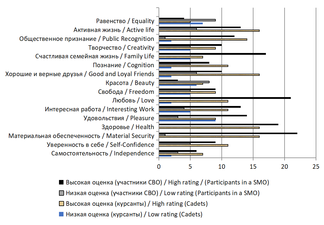 У участников СВО доминирует акцент на выживание, семейные связи, волевые и социально ориентированные качества, обеспечивающие успешное выполнение боевых задач и обесценивание идеалистичных ценностей. Такое распределение ценностей для участников военных действий может быть следствием боевого стресса, в условиях которого особо значимыми в структуре ценностей становятся базовая защищенность, эмоциональная стабильность и поддержка семьи.
