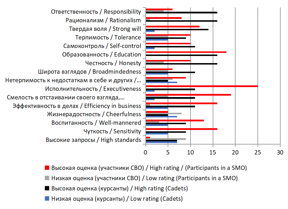 Согласно полученным данным, в группе курсантов военных училищ приоритет в иерархии инструментальных ценностей отдается честности, образованности, твердой воле, рационализму и ответственности. Наименьшая значимость обнаружена у таких ценностей-средств, как жизнерадостность и нетерпимость к недостаткам в себе и других. В иерархии инструментальных ценностей участников СВО доминируют социально ориентированные и индивидуально-волевые качества: чуткость, эффективность в делах, смелость, исполнительность, образованность и твердая воля. Минимальными оценками отмечены такие ценности, как жизнерадостность и высокие запросы.