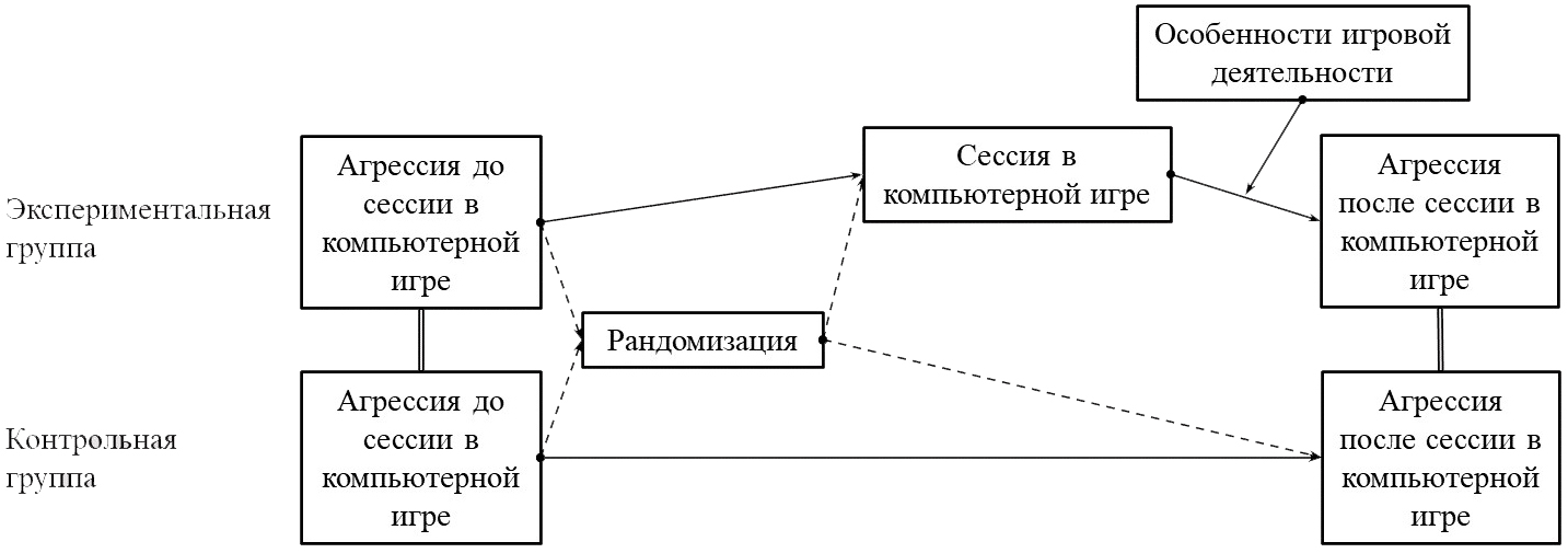 На основании представленной выше модели разработан дизайн исследования (рис. 2), в котором была предпринята попытка воссоздать цикл игровой деятельности и подтолкнуть к ней респондентов, а также смоделировать динамику агрессивных тенденций в связи с игрой в компьютерную игру.