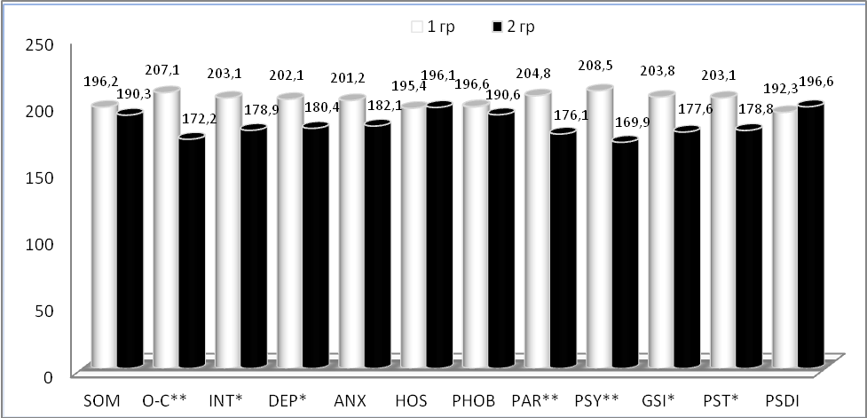 Анализируя показатели выраженности психопатологических симптомов в подгруппах мужчин и женщин, отметим различия по шкалам DEP (депрессия), ANX (тревога), PHOB (фобии), PSDI (индекс наличного симптоматического дистресса). Эти психопатологические симптомы статистически более выражены в группе женщин (см. табл. 3).