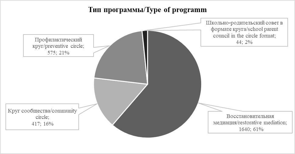 На рис. 1 представлено соотношение проведенных ШСП программ. Из диаграммы следует, что больше половины (61%) от общего числа анализируемых программ составляет восстановительная медиация, на втором месте программа Профилактический круг (21%), на третьем – Круги сообщества (16%). Школьно-родительский совет в формате круга был проведен в 2% случаев. Так, 61% программ посвящен межличностному взаимодействию, а 39% – работе с группой-сообществом.