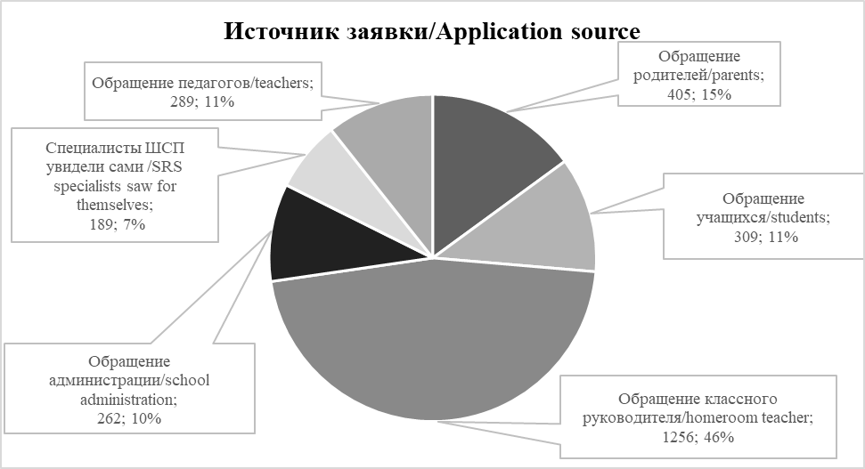 Почти половина заявок на программы поступает от классных руководителей. Данный факт сложно оценить однозначно, так как это можно интерпретировать и как внимательность к проблемам в классе, доверие к ШСП, и как перекладывание необходимости помощи ученикам на других. В результатах нашего исследования, остающихся за пределами данной статьи, была выявлена идея о важности и возможности проведения восстановительных программ учителями (при условии прохождения соответствующего обучения).