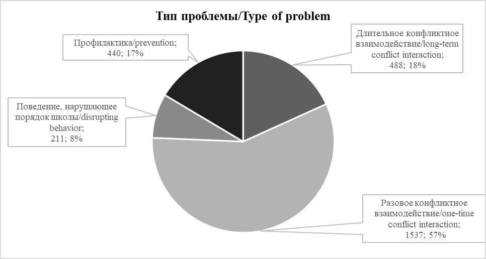 Рис. 3 посвящен распределению частоты решаемых типов проблем. 57% программ посвящены работе с разовыми конфликтами, тогда как длительное конфликтное взаимодействие встречается лишь в 18% случаев. Профилактика занимает 17% практики, а обсуждение нарушающего поведения – 8%.