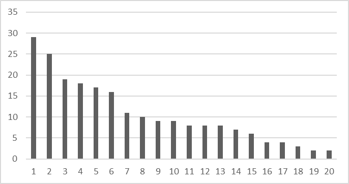 Рис. Показатели популярности тематик вирусных видео ТикТок (215 видео): по оси ординат – абсолютная частотность; по оси абсцисс: 1 – О В.В. Путине; 2 – Школа и экзамены; 3 – Символы-мотиваторы; 4 – Об отношениях; 5 – Приколы и хайп; 6 – О языках; 7 – Питомцы; 8 – Испытания и тренировки; 9 – Мужская работа; 10 – Персоны; 11 – СССР и история; 12 – Россия и русские; 13 – Спорт; 14 – Повтори-ТикТок; 15 – Оппозиция; 16 – Природа; 17 – Тело; 18 – О Китае; 19 – Новороссия и Крым; 20 – О В.А. Зеленском