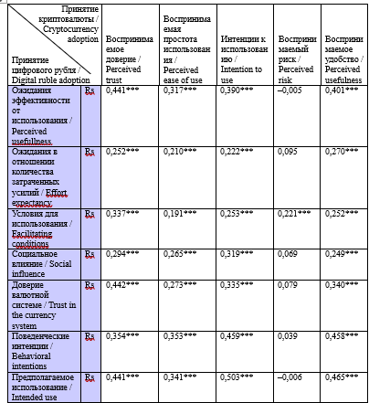 Результаты корреляционного анализа методик «Оценка принятия цифрового рубля» и «Оценка принятия криптовалюты» приводятся в табл. 3.