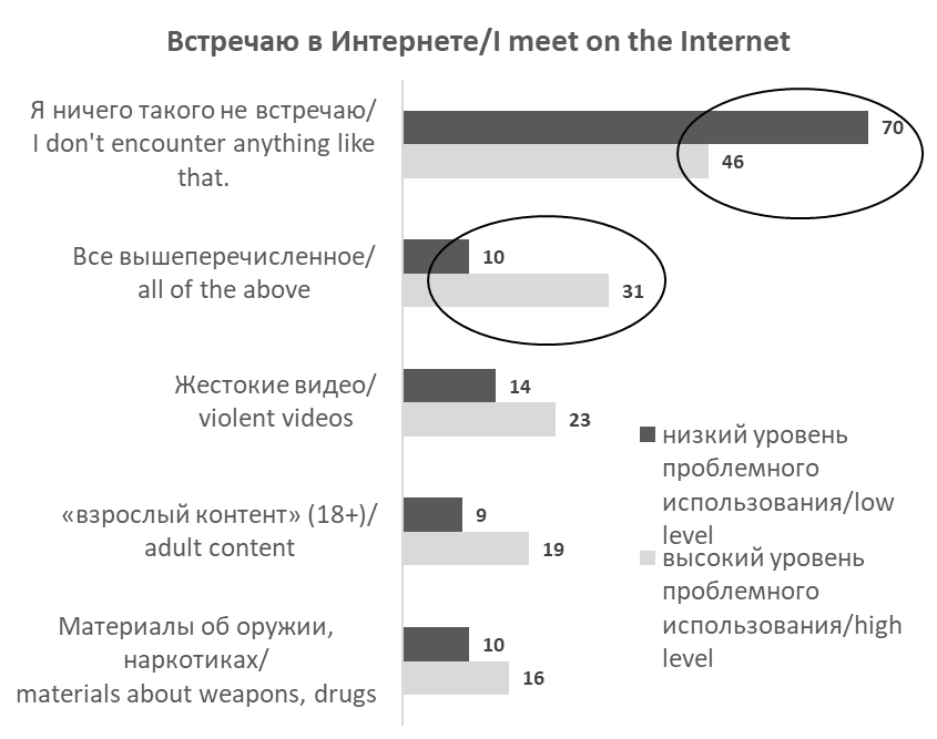 Кроме того, подростки из группы с проблемным использованием чаще сталкиваются со следующими рисковыми ситуациями (χ² = 46,368, df = 12, p < 0,001): «взламывали страничку и рассылали спам от моего имени» (9% в группе с проблемным использованием и 6% – с беспроблемным использованием), «систематически писали гадости и преследовали» (10% и 2% соответственно), «делали предложения, которые заставляли чувствовать себя неловко» (8% и 1% соответственно), «делали противозаконные предложения» (5% и 1%).