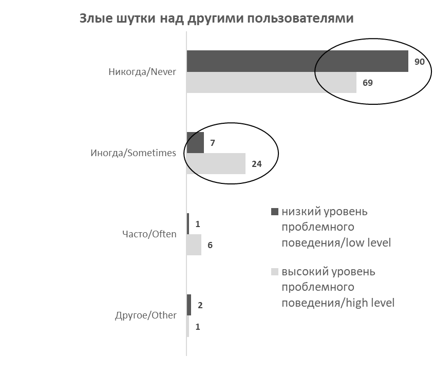 Следует отметить, что большинство респондентов обеих групп выбрали ответы «никогда» или «иногда» по обоим вопросам, что указывает на относительно низкую частоту распространенности описанных поведенческих практик. В группе с низким уровнем проблемного использования 66% подростков никогда не становились жертвами насмешек, а 90% не принимали на себя роль агрессора; в группе с высоким уровнем – 34% и 69% соответственно. Только 10% подростков с выраженным проблемным использованием социальных сетей и 6% в беспроблемной группе сообщили об опыте регулярного воздействия (вариант ответа «часто»).