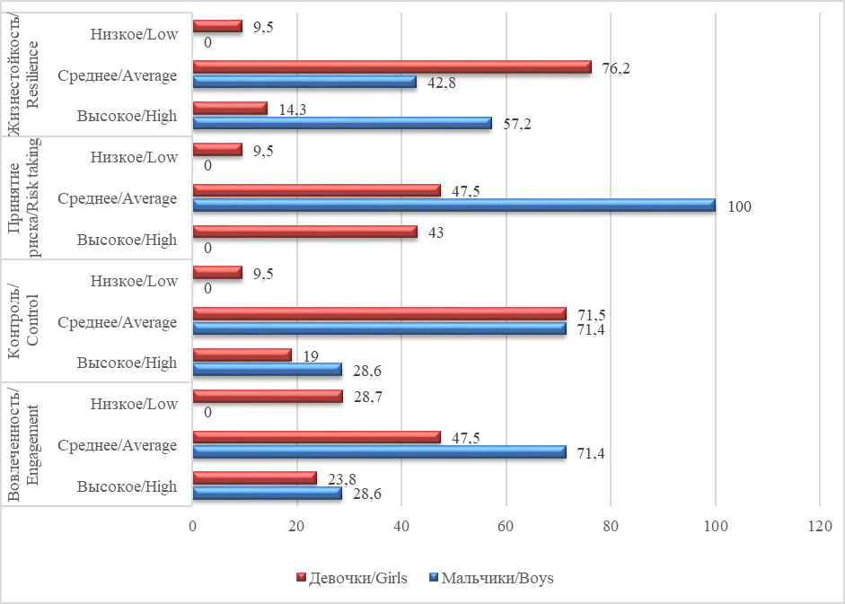 Результаты по опроснику СОРЕ продемонстрировали различия в интегральных показателях респондентов в зависимости от их пола. Средний интегральный показатель зафиксирован у 14,2% мальчиков и 30,4% девочек. Пониженному интегральному показателю соответствовали результаты 85,8% мальчиков и 60,8% девочек. Интересно отметить, что низкие значения полной шкалы были выявлены только в группе девочек (8,8%), что подчеркивает наличие подгруппы с особо низким уровнем адаптивности к стрессовым ситуациям, требующей специального внимания.