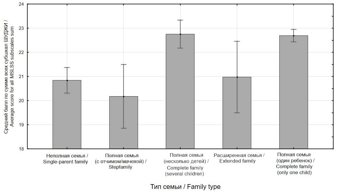 Рис. 1. Общая удовлетворенность различными сторонами жизни (средние суммы по всем субшкалам методики ШУДЖИ) у подростков из разных типов семей (N = 1397)